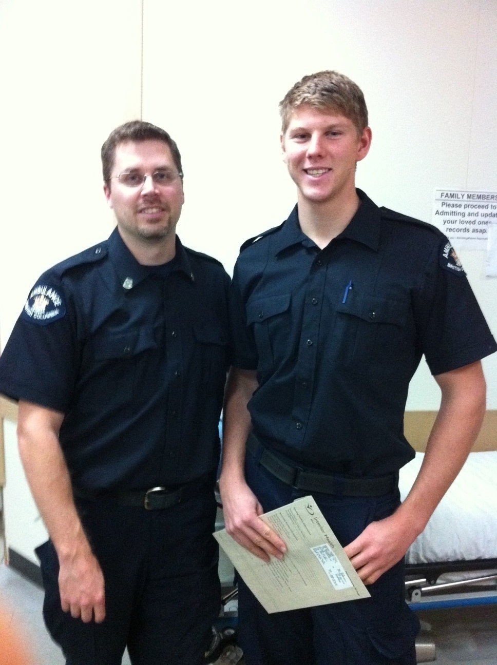 Former EMR student Dion Siluch at the Paramedic Academy (left) and with Mr. Volk working for the BC ambulance service. Dion is now starting his own first aid company.